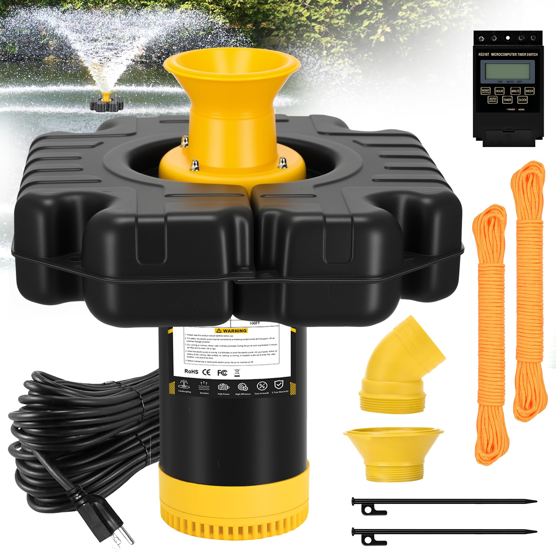 Pond Fountain Aerator, 1HP 15000 GPH, with Timer & 100FT Rope & Cord