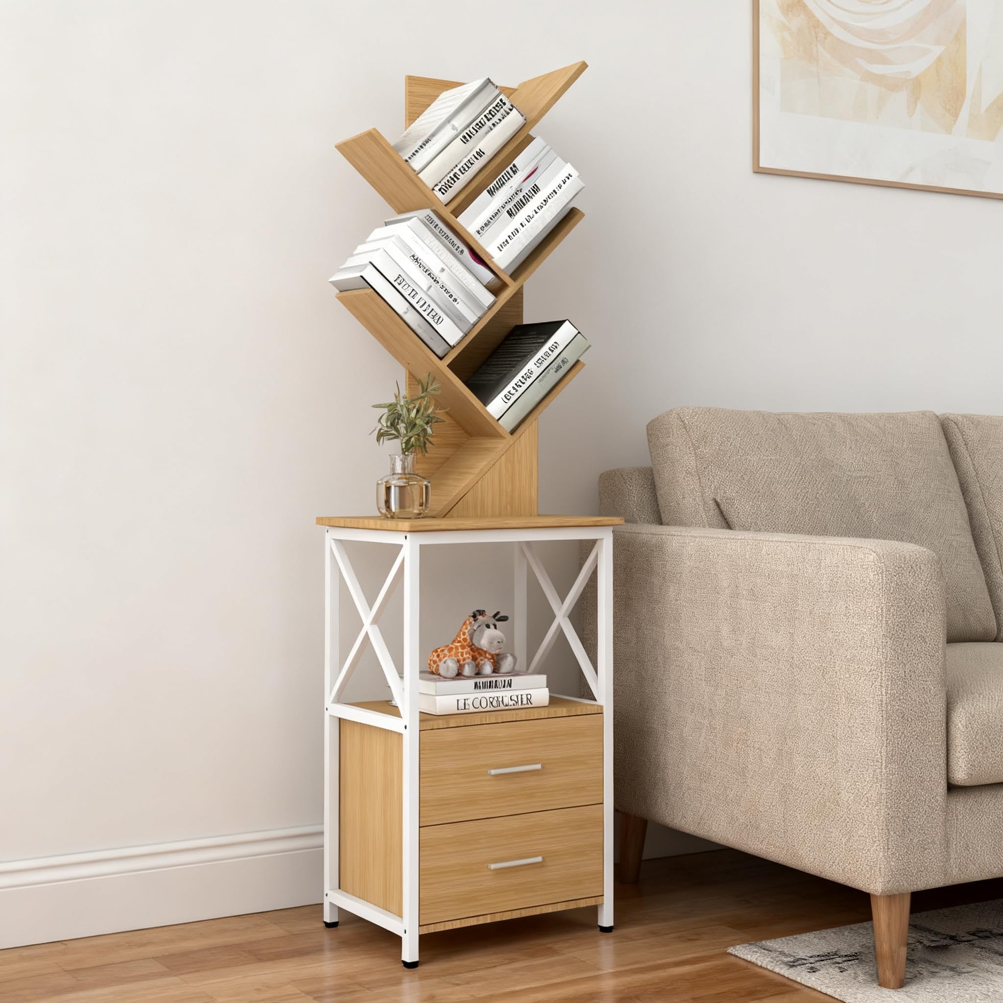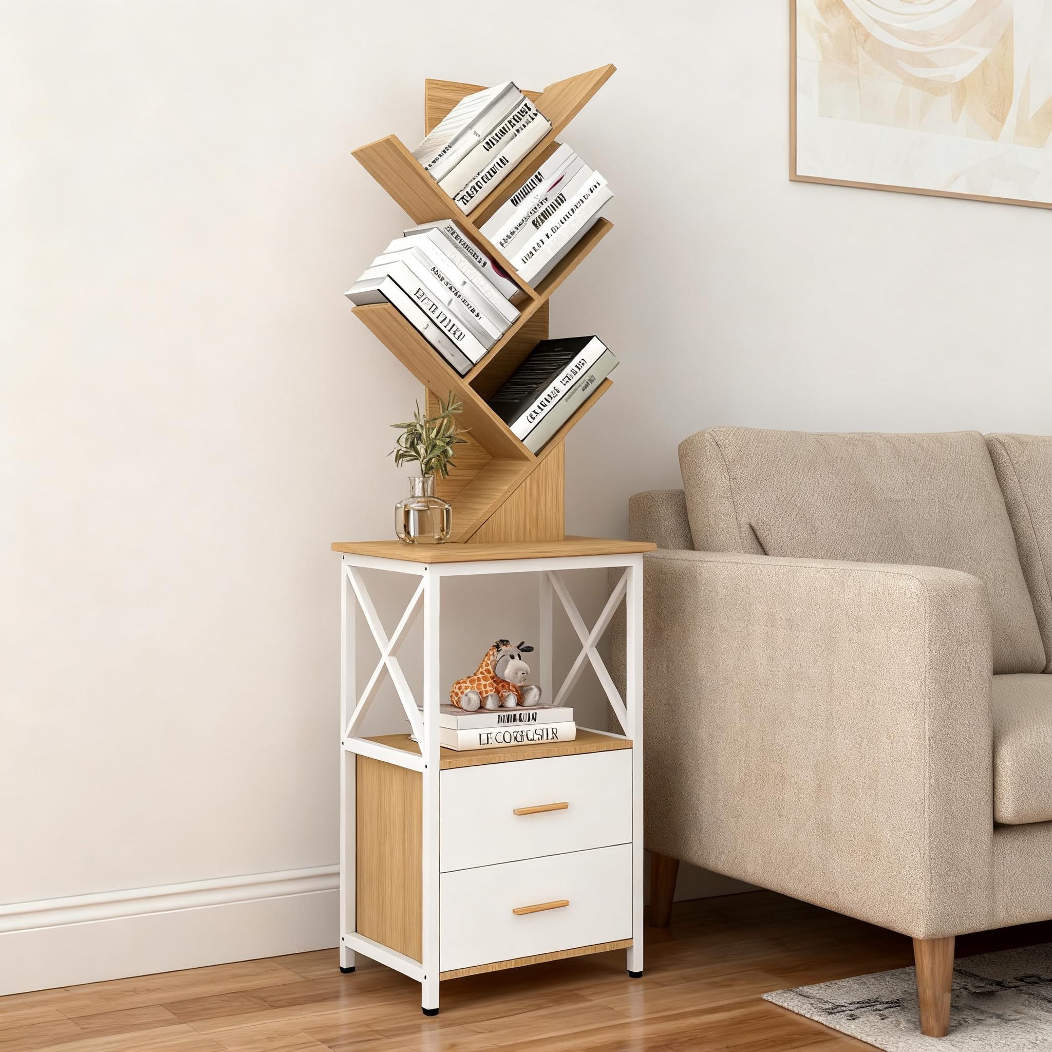 Bookshelf with Double Drawer, 5 Shelf Tree Bookshelf, Wooden Bookshelves Storage Rack, White Drawer