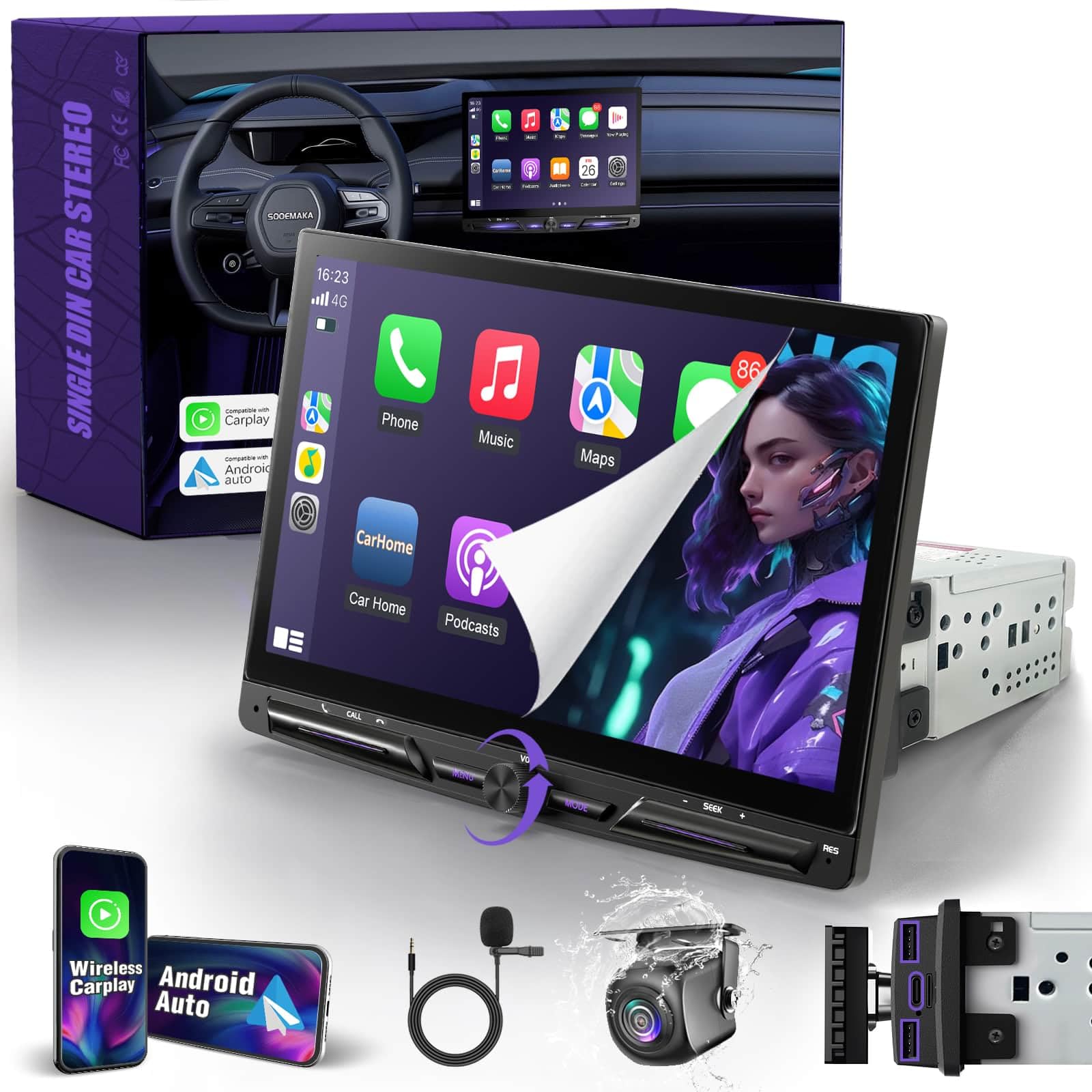 Single Din Touchscreen Radio with Wireless Apple Carplay&Android, 10 inch QLED