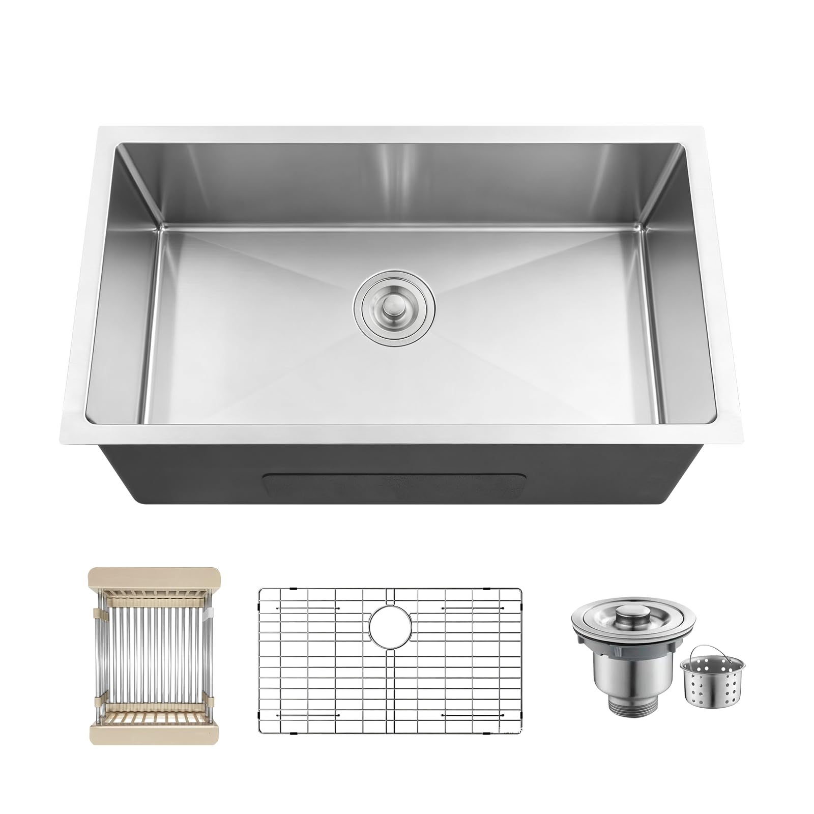 32 Inch Undermount Kitchen Sink, 32x19x8 inch Single Bowl Stainless Steel Handmade 16 Gauge Under Counter