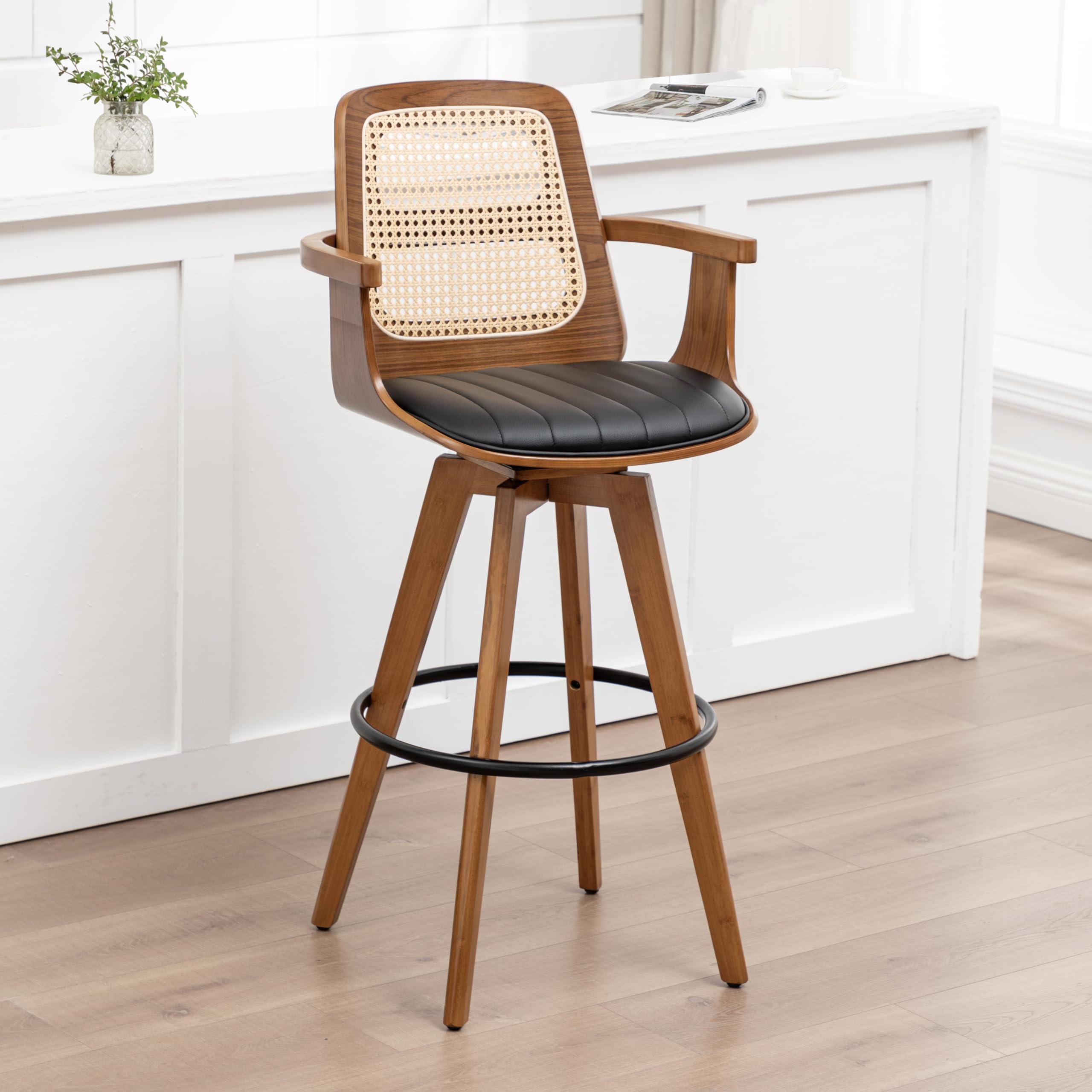 Set of 1 Counter Height Stools, 26.3" Seat Height 360° Swivel Stool with Ergonomic Rattan Back, Faux Leather Seat