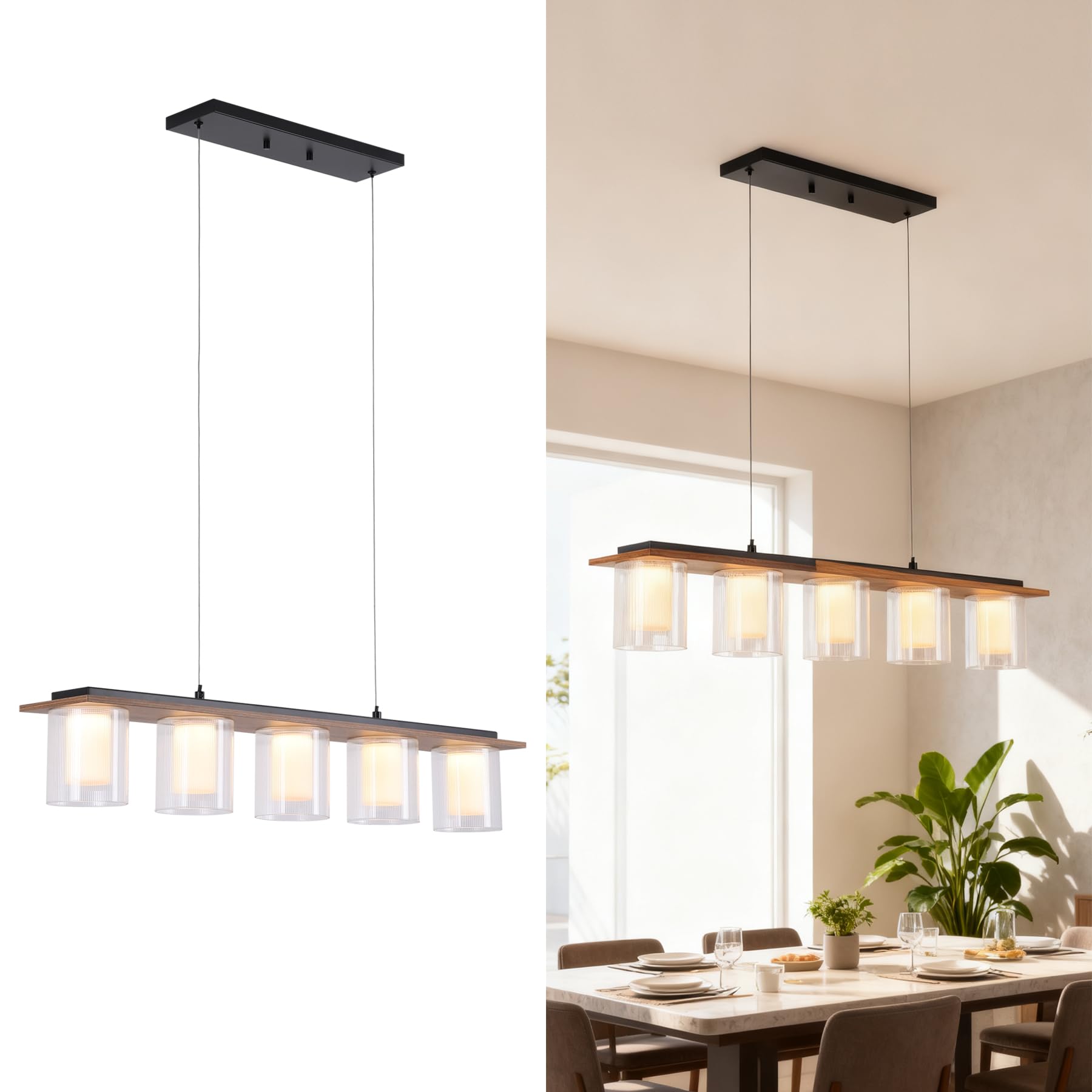 Kitchen Island Lighting, 35-Inch Linear Pendant Light with Double Glass Shades, Matte Black & Wood
