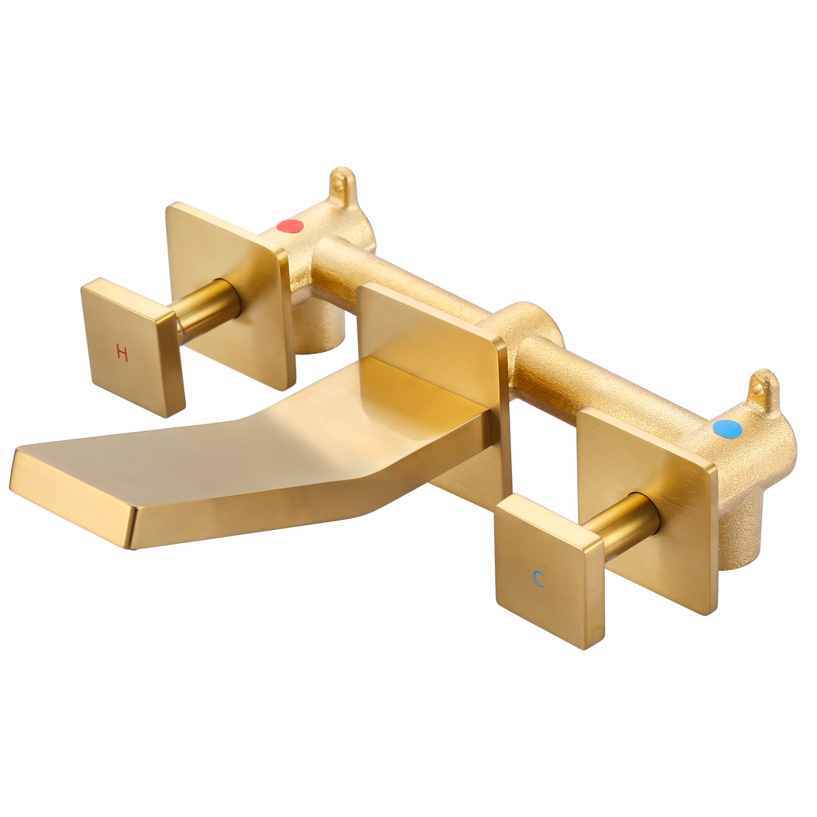 Wall Mount Bathroom Faucet - Brushed Gold Dual Handle Wall Mount Waterfall, Brass Rough-in Valve
